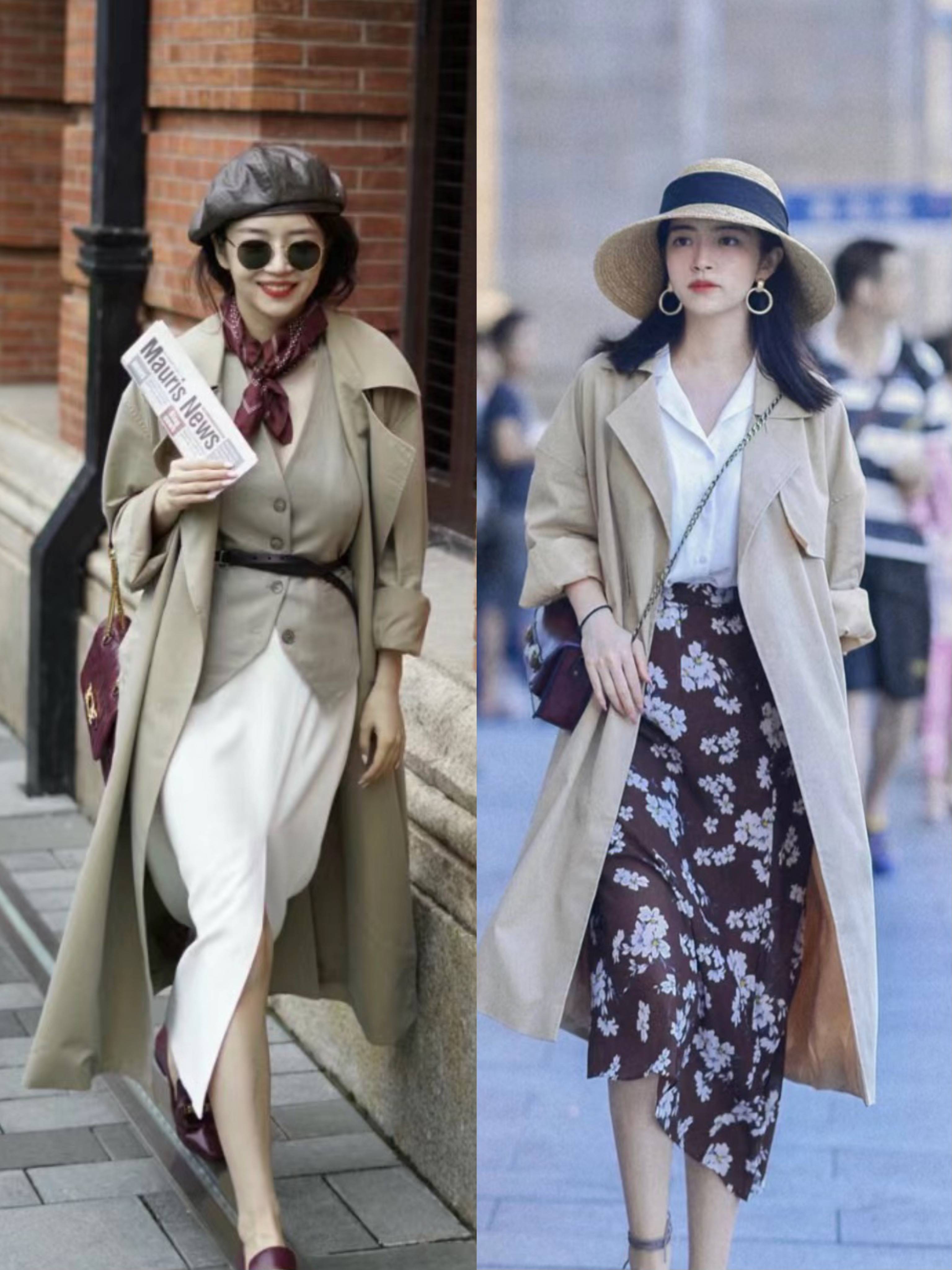 风衣+连衣裙的穿着方式,是一种比较温柔优雅的呈现。连衣裙的浪漫温柔,与风衣的挺阔潇洒,可以自然的呼应,表现出女人的大方气质。