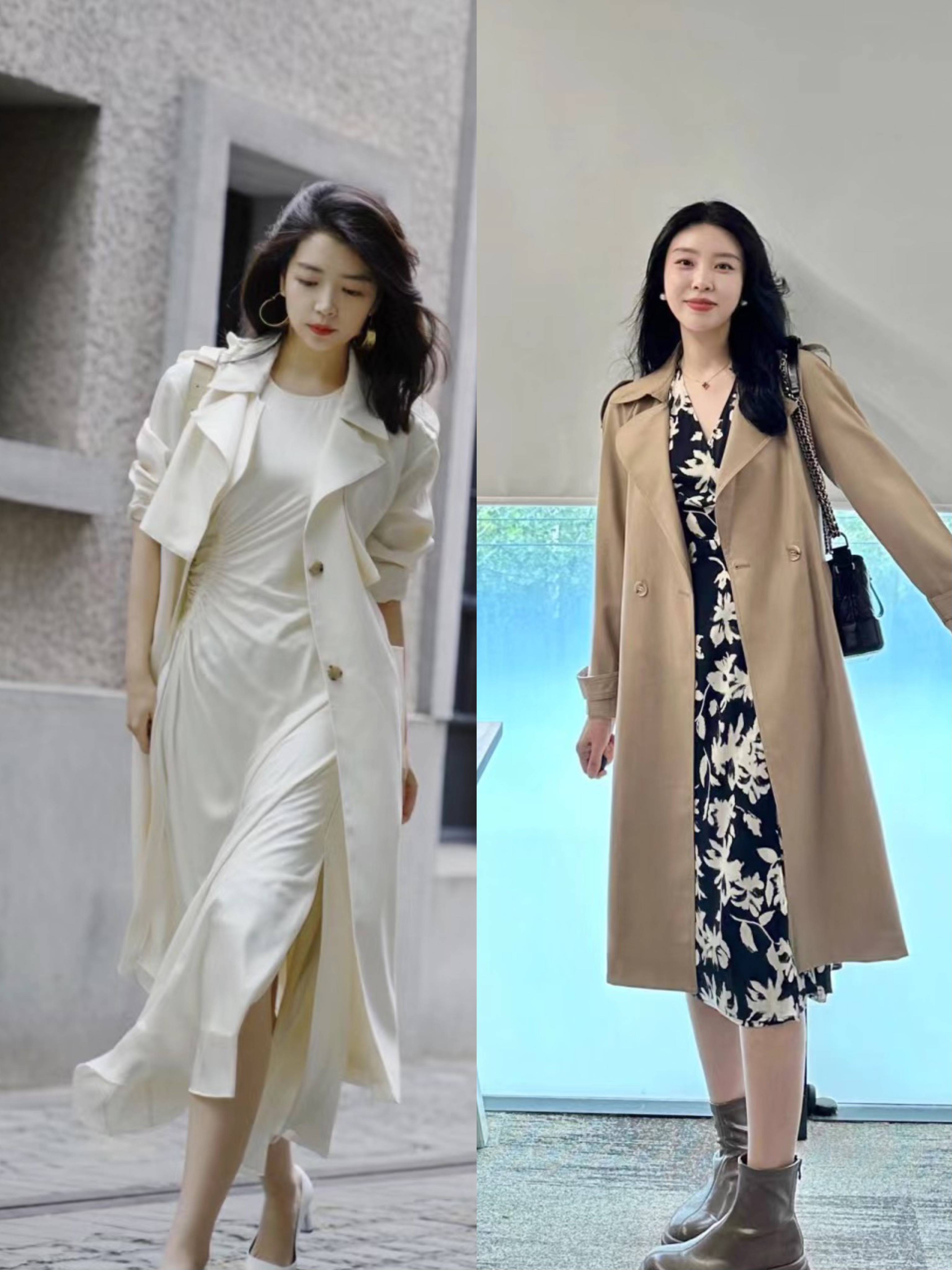 当我们选择风衣+连衣裙的组合时,连衣裙的搭配可以分为两种形式。一种是连衣裙的裙摆超过风衣下摆,更加温柔浪漫。