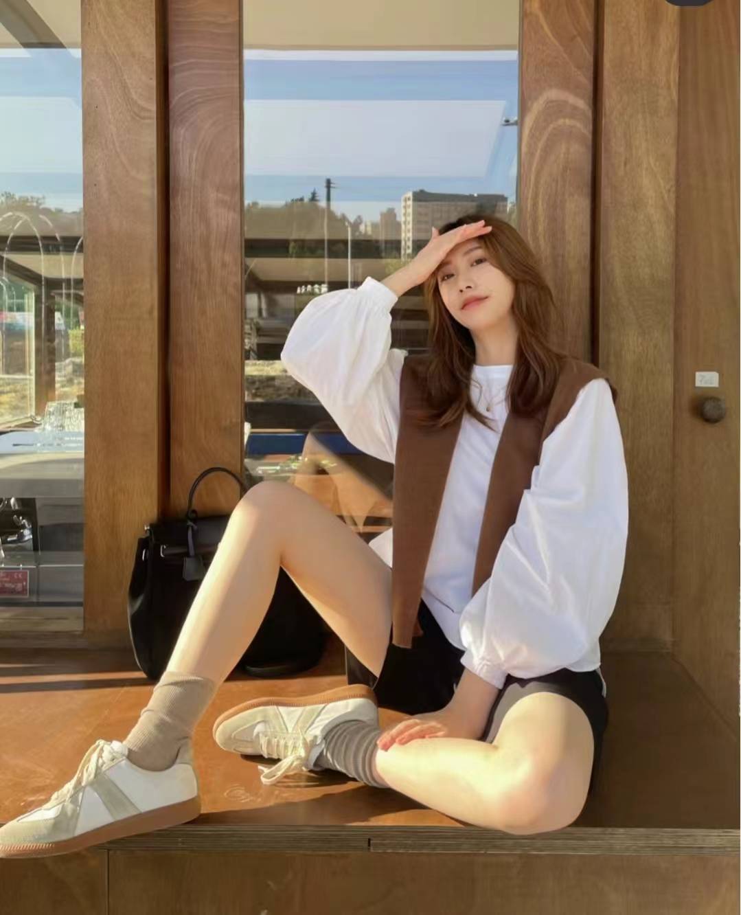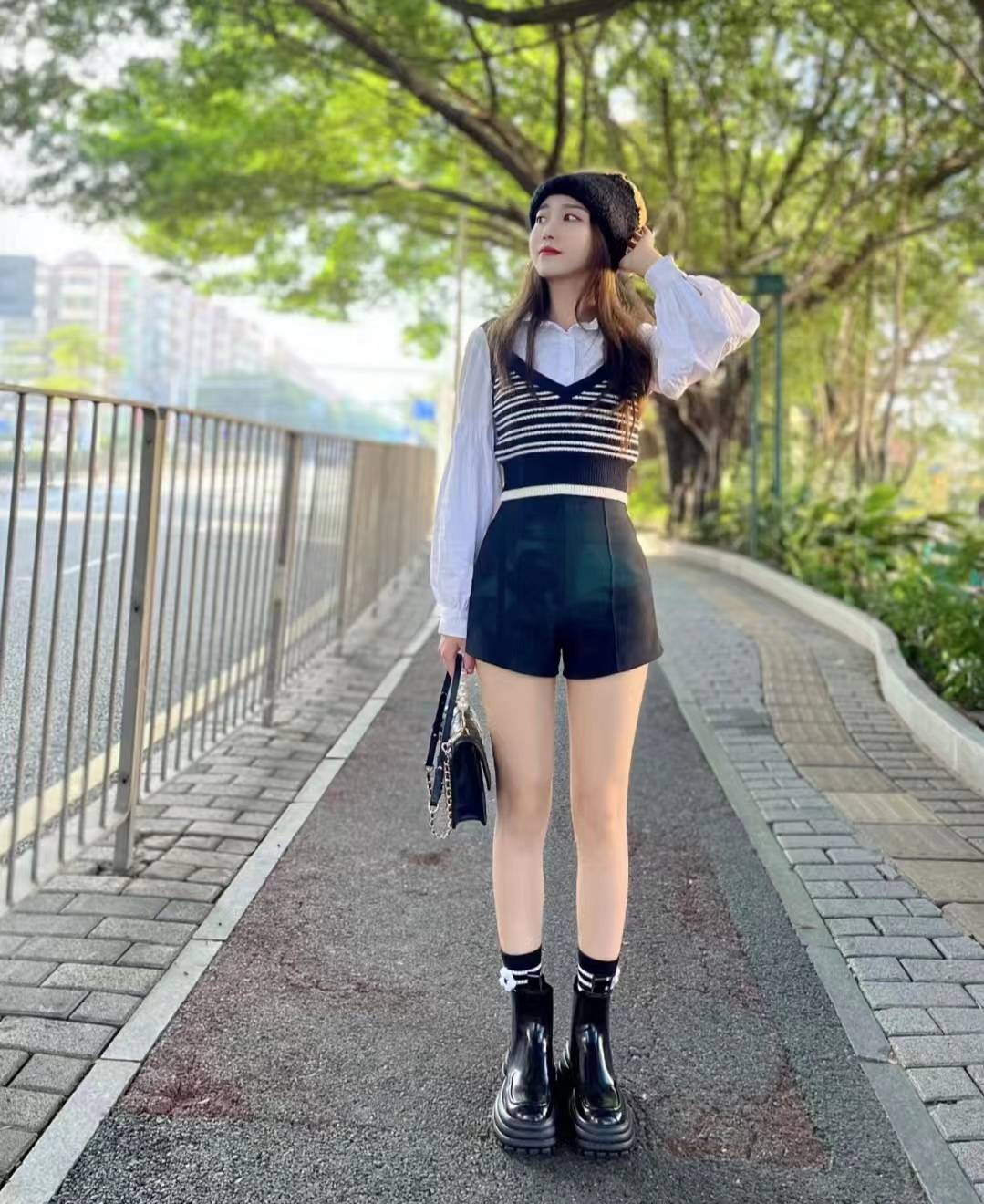 时髦女知识分子风(学院风):黑白色条纹毛衣背心超减龄,搭配泡泡袖白衬衫是绝配!下半身穿了黑色高腰短裤和黑色厚底短靴,初秋叠穿大法拿捏了,洋气又舒适。