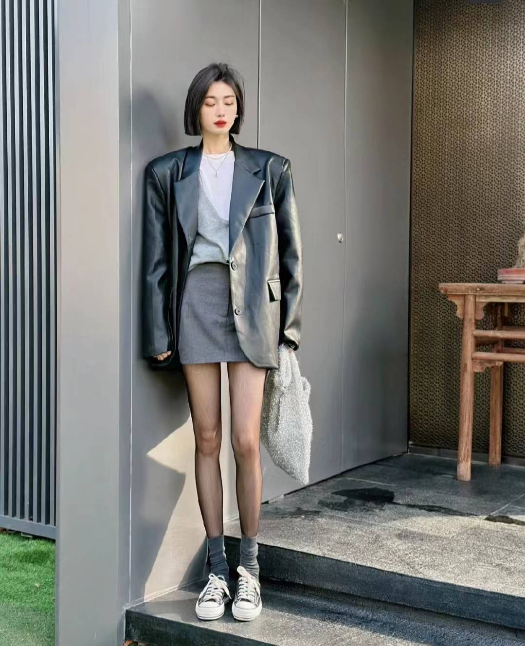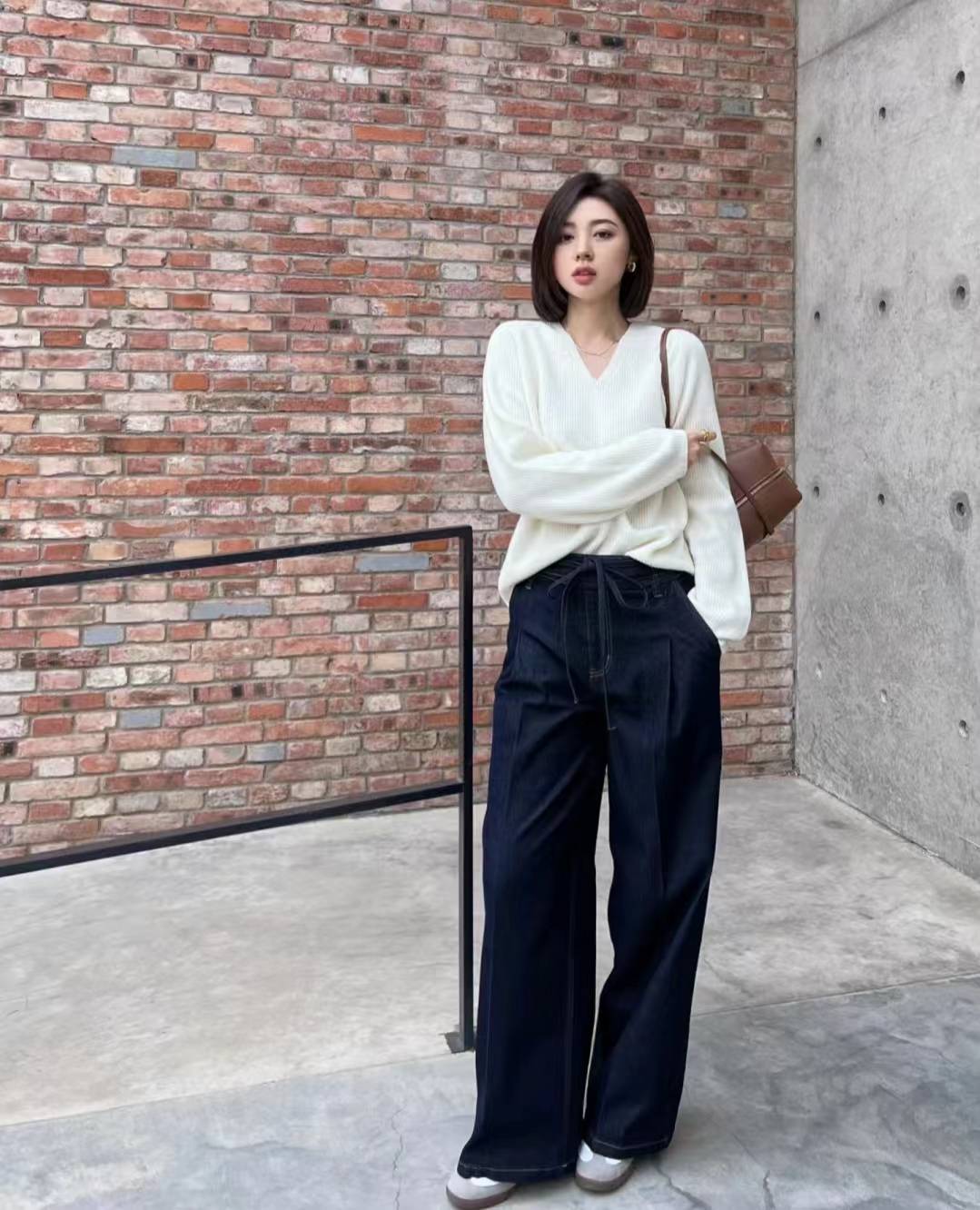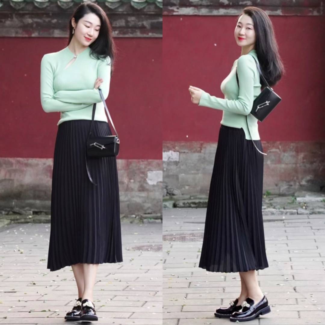 针织衫+百褶裙+乐福鞋都是秋日的百搭单品,中式盘扣元素又增添了一份温婉气质,搭配质感黑色小包包,初秋氛围感又拿捏了。