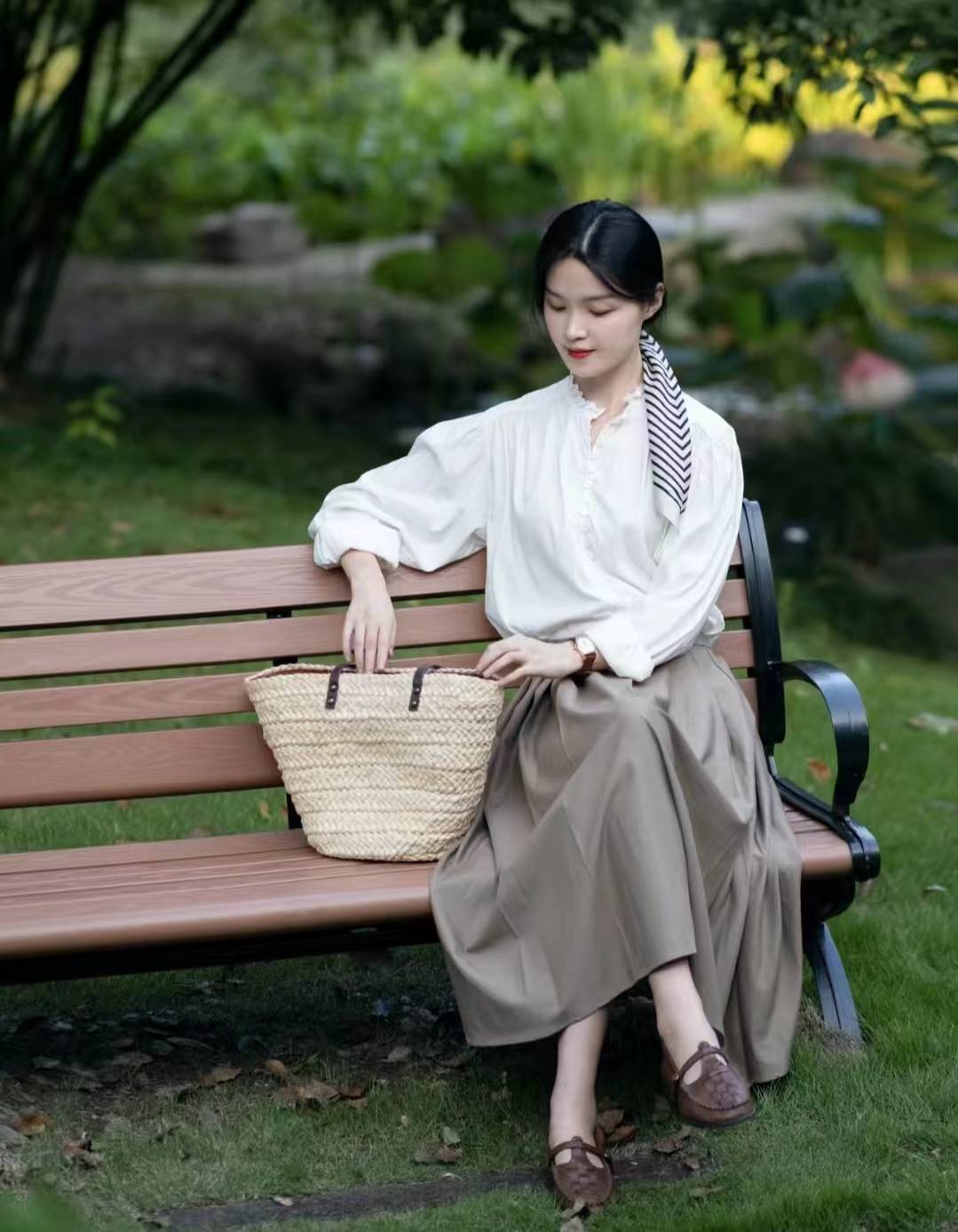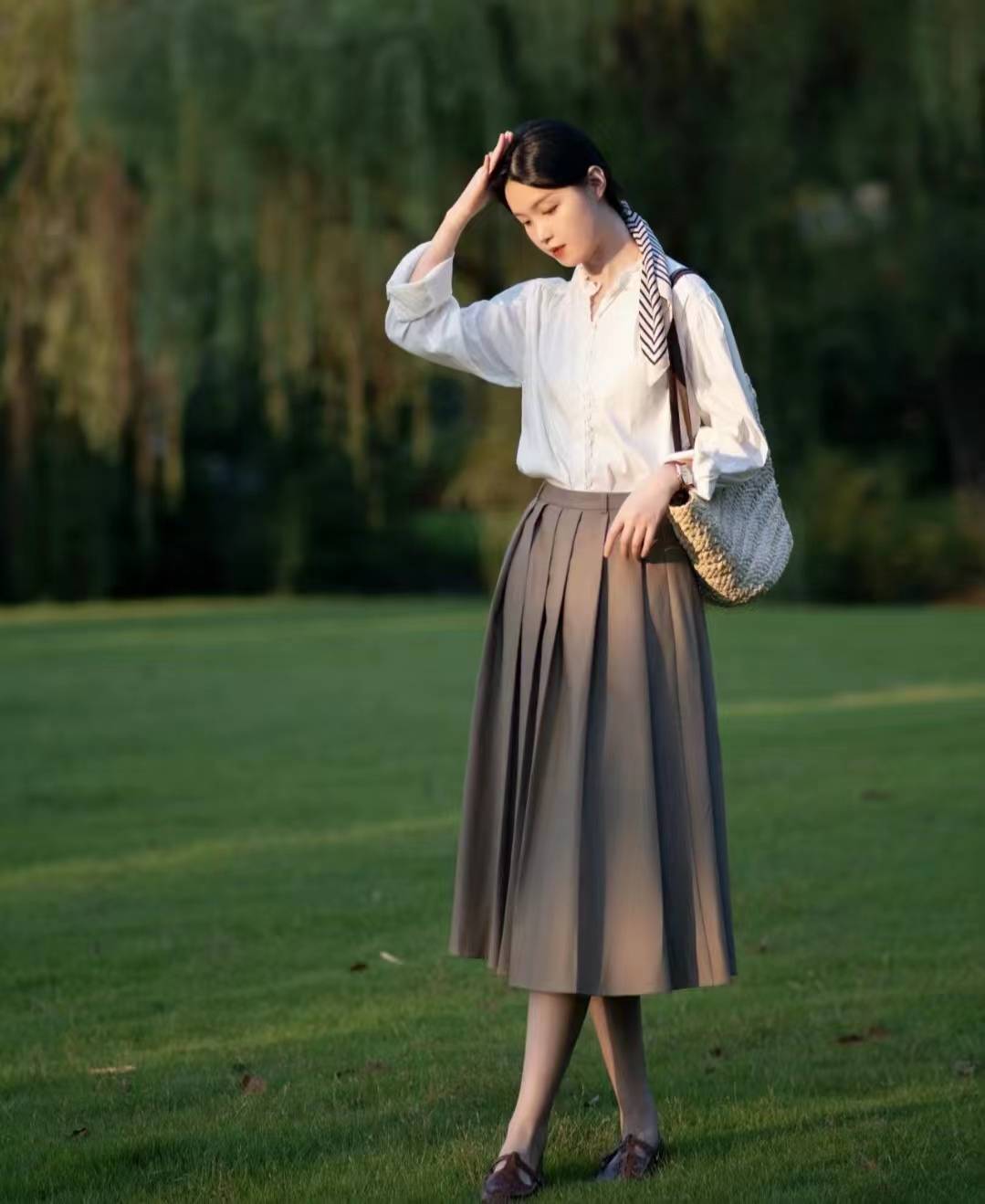 傍晚的阳光真的太美啦,衬衫+半裙是初秋不出错的法式搭配,色系干净温柔适合日常通勤,搭配了丝巾和手表提升精致度。