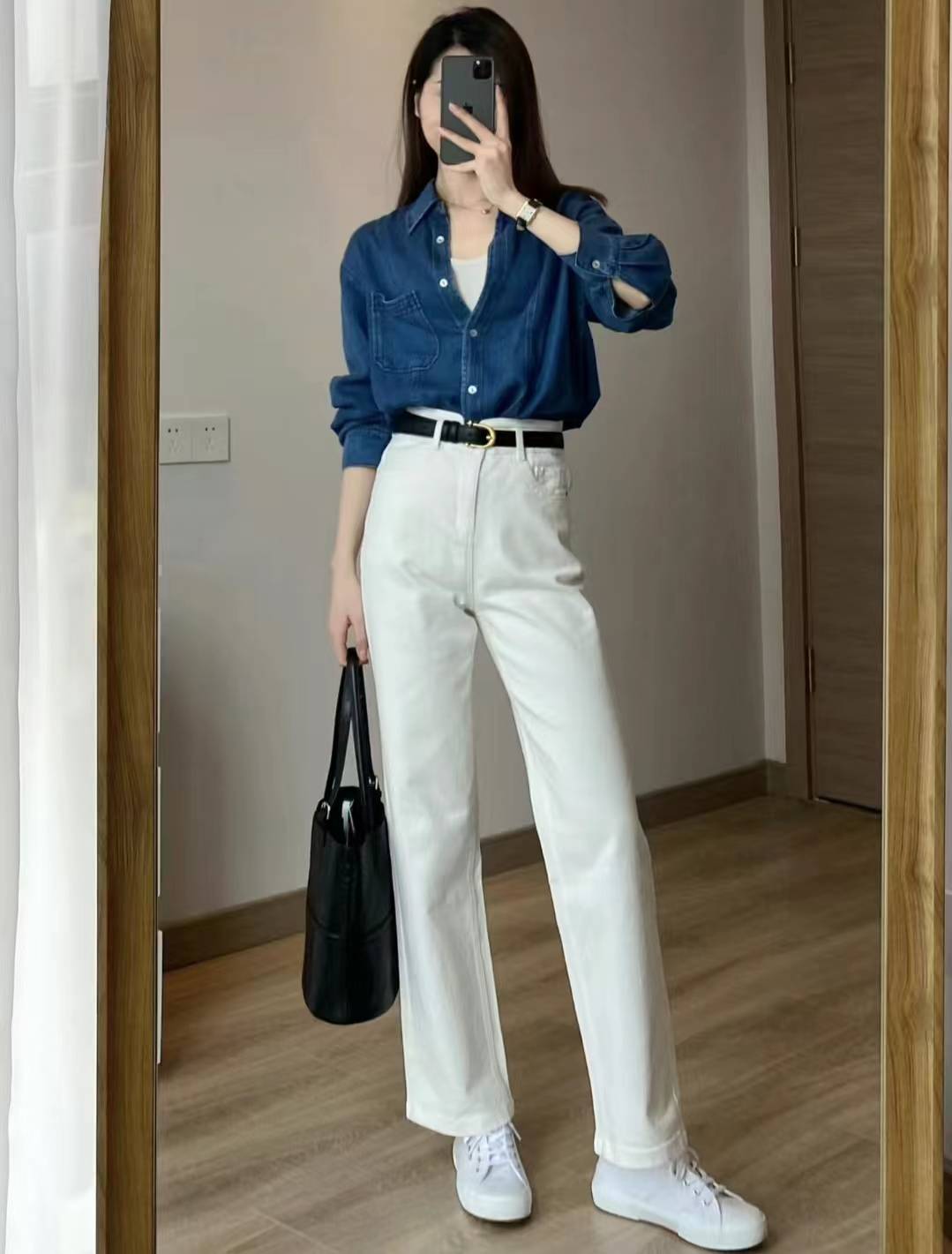 简单又好看的一套:蓝色牛仔衬衫是初秋季节离不开的时髦单品,内搭了白色背心打底,下半身是高腰的直筒牛仔裤和白色帆布鞋,把上衣扎进裤腰系了黑色腰带,更凸显身材比例。