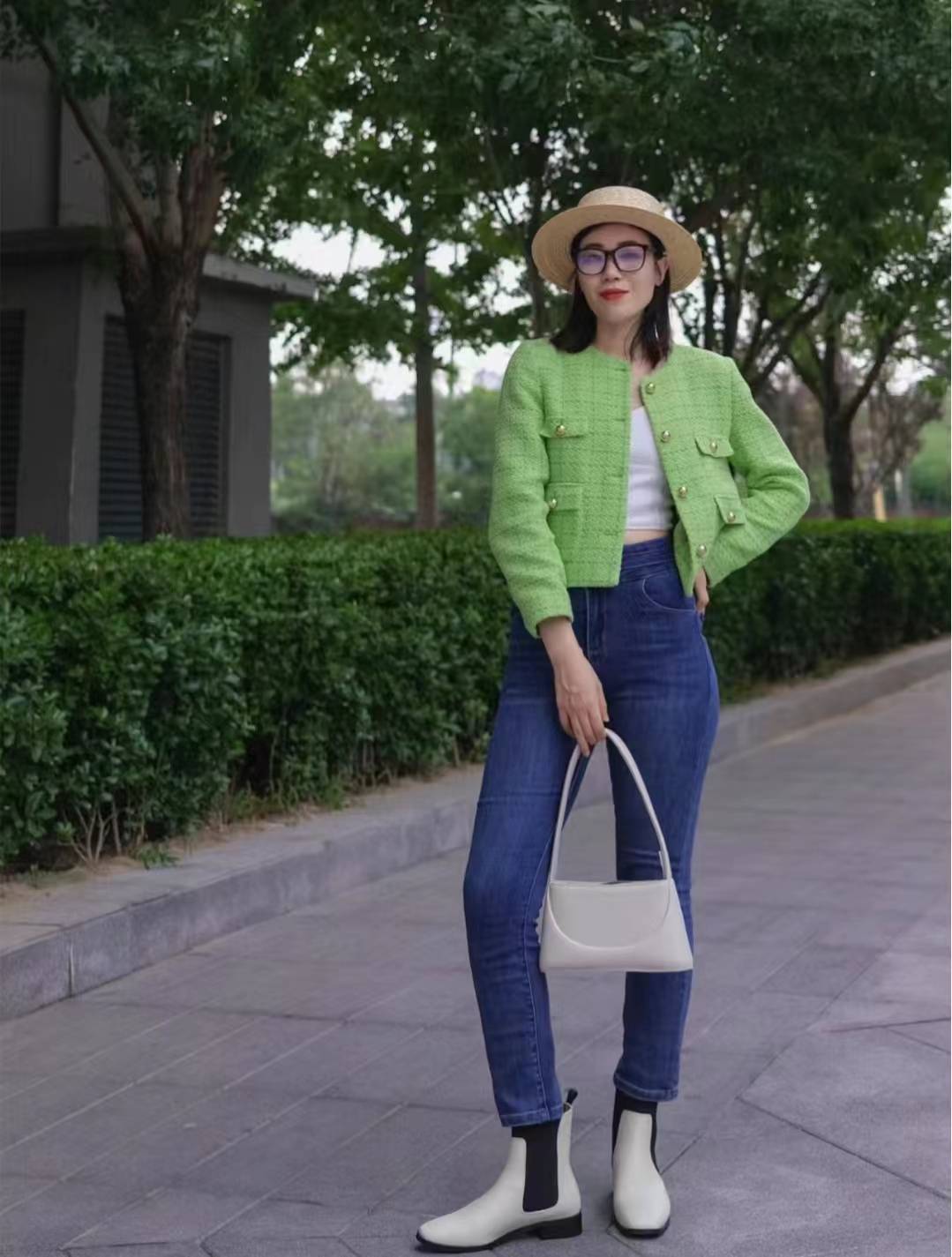 look3 果绿色小香外套+白背心/修身牛仔裤