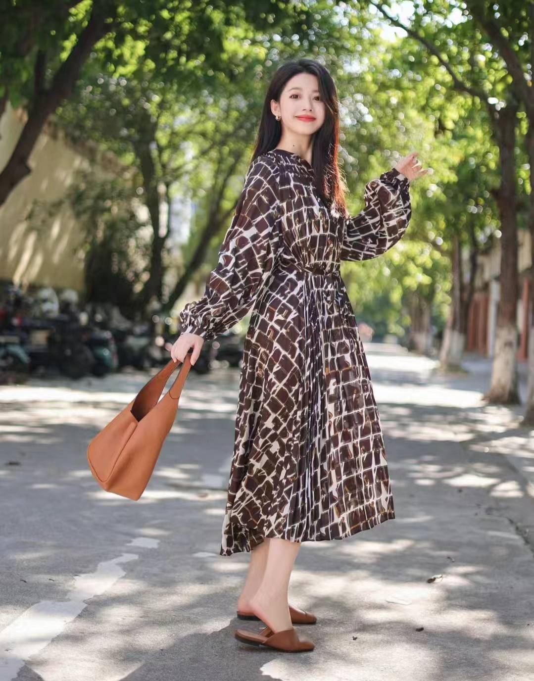 look2 大地色格子连衣裙