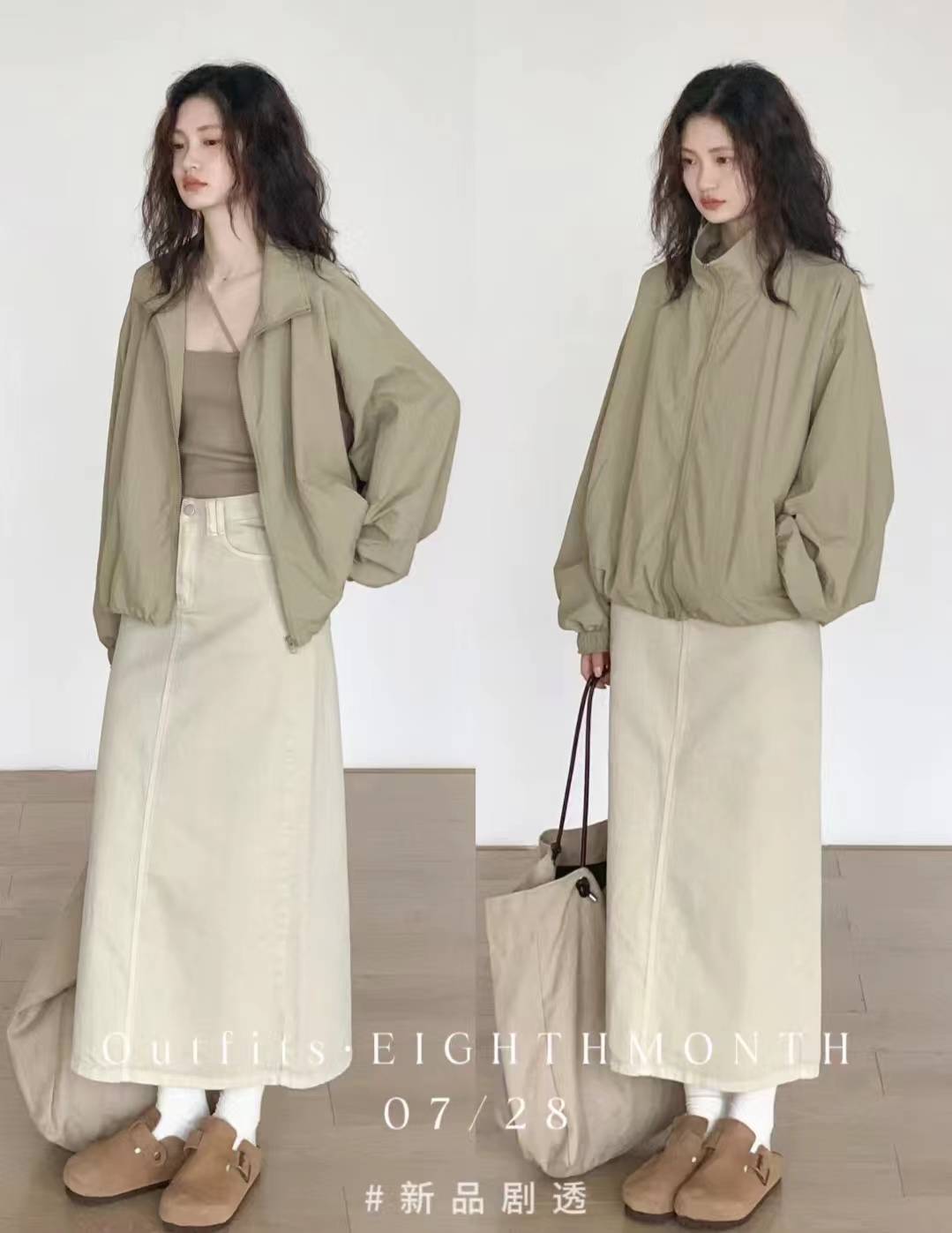 已经开始想念秋日的慵懒松弛氛围:七月份的尾巴迎来新一轮漂亮衣服,大地色的夹克衫内搭了同色系吊带背心和米色的牛仔长裙,一套应季又简约。
