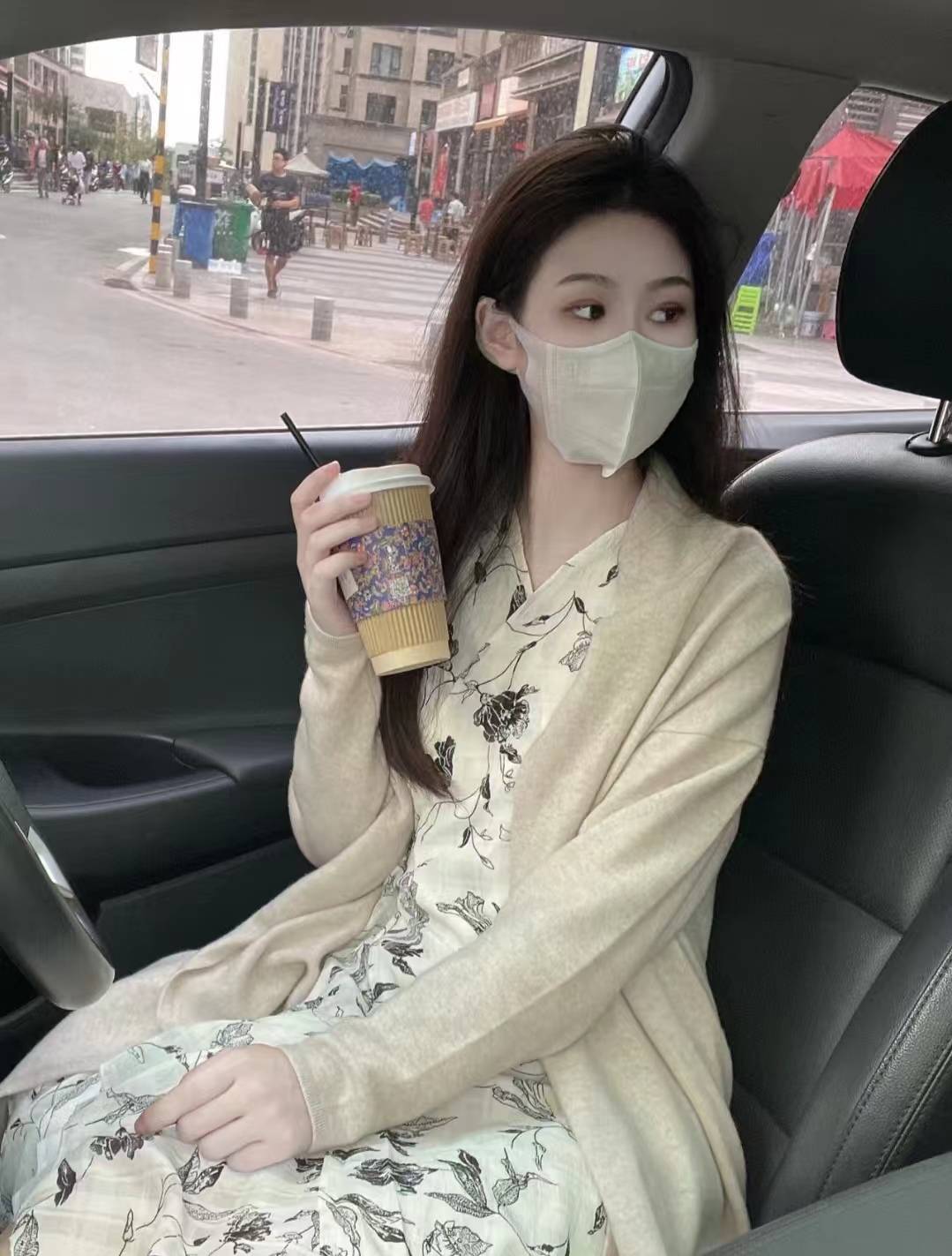 look9 奶白色针织开衫+中式印花连衣裙