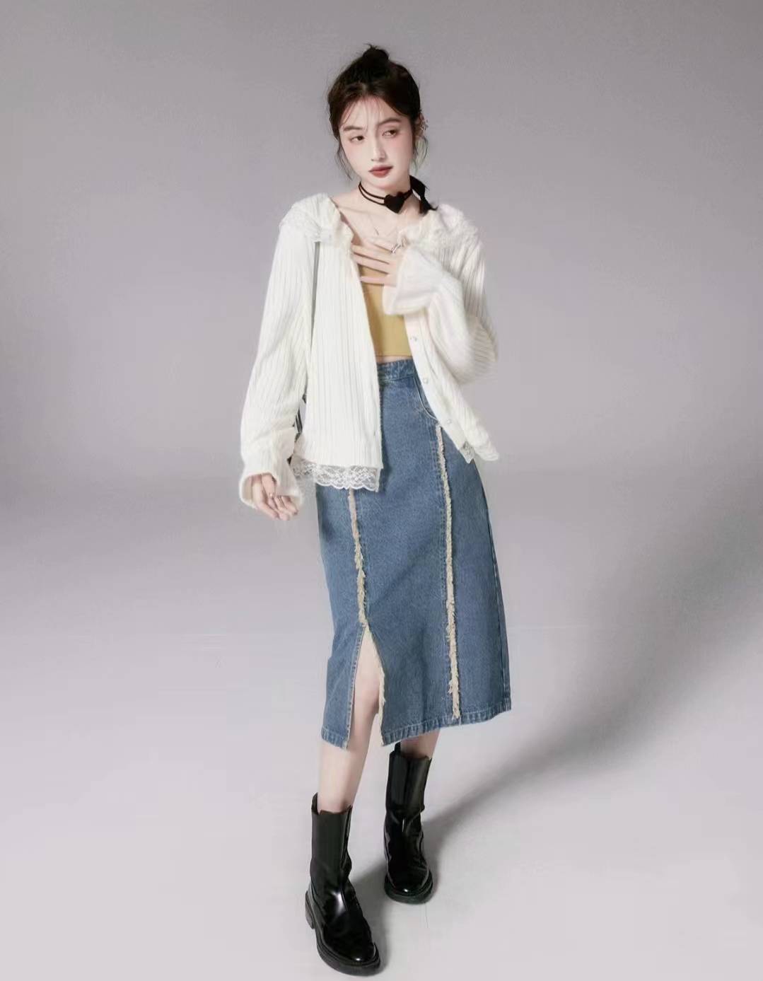 look12 蕾丝边开衫+设计感牛仔裙