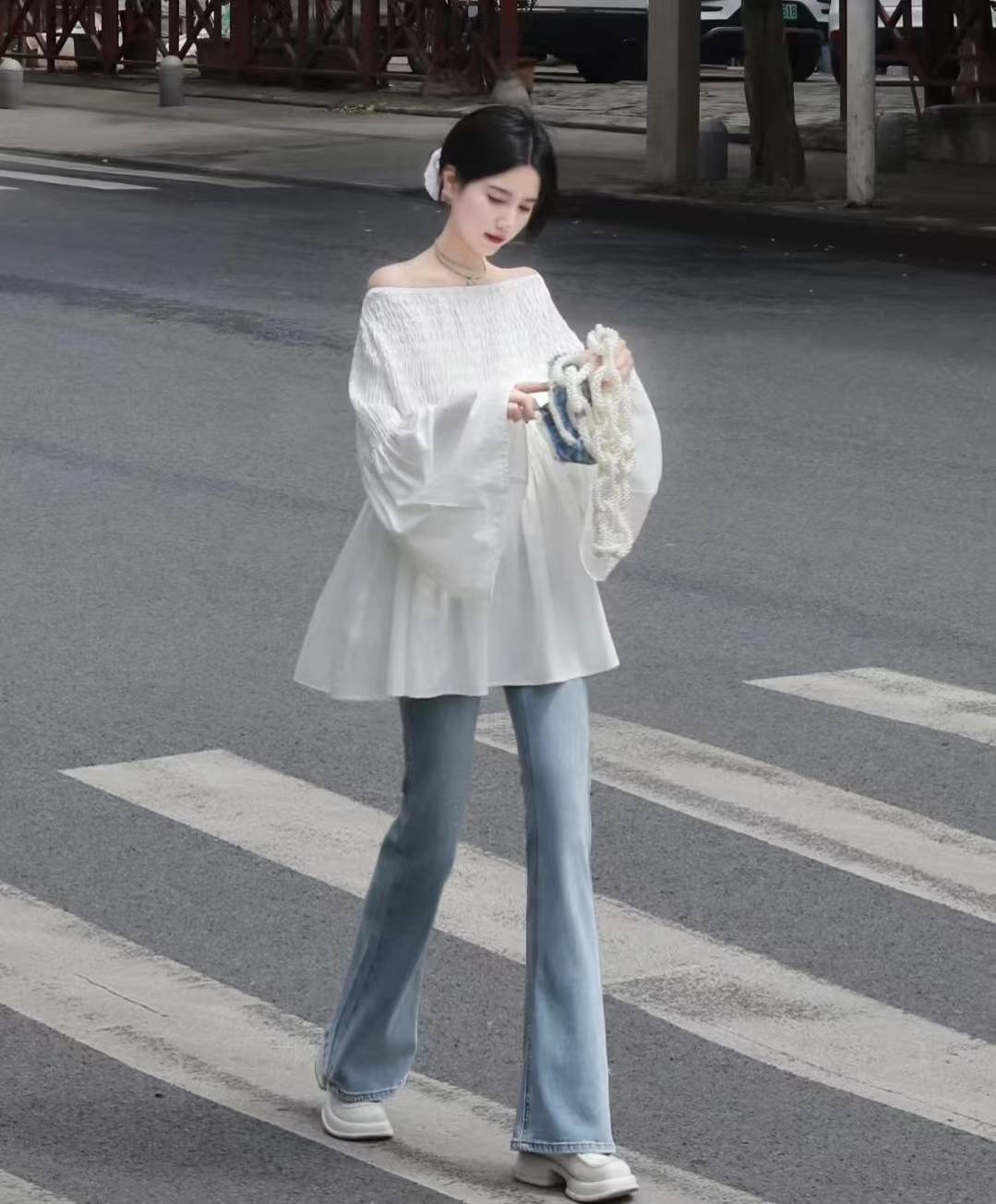 look8 白色一字肩衬衫+蓝色微喇牛仔裤